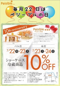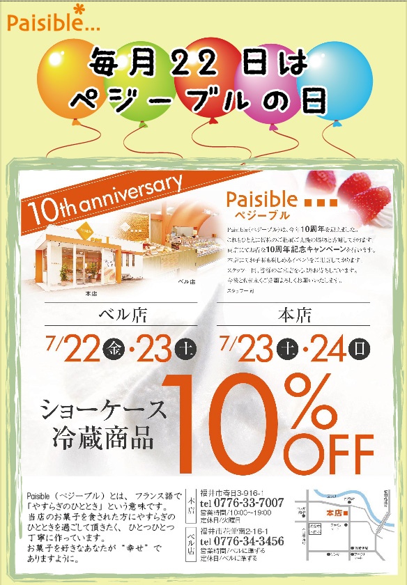 兄弟店「ペジーブル」では10周年記念キャンペーン中です。 ショーケース冷蔵商品、10%OFF開催中です。 本日7/22(金)と明日7/23(土)はペジーブルベル店にて開催。 明日7/23(土)と明後日7/24(日)はペジーブル本店にて開催。 登場以来人気沸騰の「メロン玉1080円」や 農薬不使用、化学肥料不使用のあわら市の契約農家から仕入れた大粒の甘酸っぱいブルーベリーを使用した「ブルーベリータルト450円」「ブルーベリーのパンナコッタ389円」などもおすすめです!