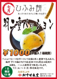 毎月1日、2日、3日のみ販売する「一二三餅」。 7月は「羽二重パッション」です。 パッションフルーツをゼリーにして、白餡と羽二重餅で包みました。 福井テレビの福むすびで包装されてから、問い合わせ殺到のお餅を一二三餅限定で販売いたします。 7/1(土)~7/3(月)までの限定販売です。 4個1箱 税別1000円にて販売いたします。 当日中にお召し上がりください。 消費期限が当日限りとなるため発送はできません。ご了承くださいませ。 店頭でのみの販売です。