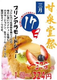 3/17(土)甘泉堂の日 「プリンアラモードシュー」17日のみ販売