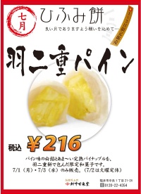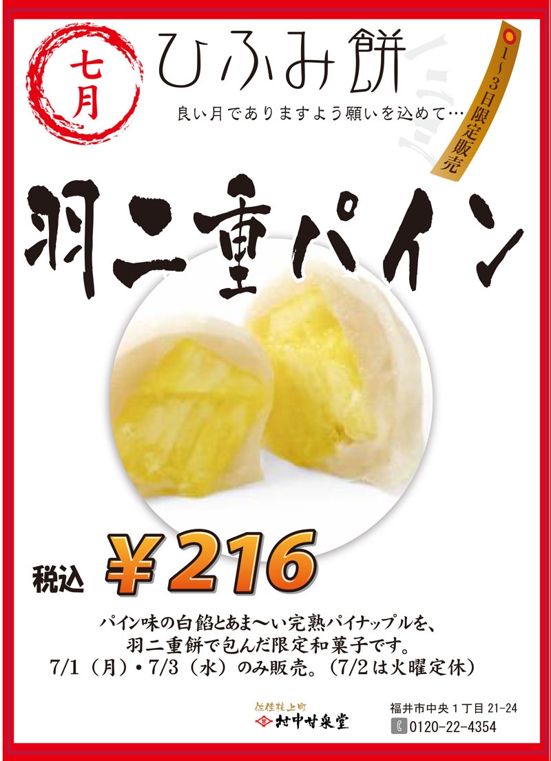 7月の【一二三餅】は7/1(月)・3(水)の開催です^^ パイン味の白餡とあま~い完熟パイナップルを羽二重餅で包んだ限定羽二重餅です。 1個 税込216円 期間限定の和菓子をお楽しみください。 7/2(火)は定休日ですので、ご注意くださいませ。