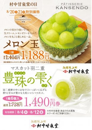 毎月第3土曜・日曜は甘泉堂の日 8/20(土)・21(日)は、「メロン玉」をお得に販売します。 メロンの実をくりぬいて、中に 生クリーム、レモンゼリーを入れた メロンを丸ごと楽しめる一品です。 通常1個税込1404円のところ、税込1188円にて販売します。 ※契約農家さんからの入荷により、品種が変更になることもございます。 あらかじめご了承くださいませ。 ※甘泉堂の日なので、各種ギフトの箱代サービスもご好評いただいています。
