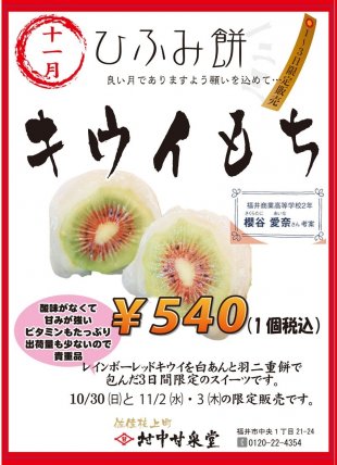 アオハルプロジェクトで、福井商業高校2年の櫻谷さんが考案した「キウイもち」!!! レインボーレッドキウイを丸ごと1個使用し、白あんとともに、羽二重餅で包んだスイーツ。 酸味がなくて甘みが強いレインボーレッドキウイ。 キウイの酸っぱさが苦手な人でも食べられる。ビタミンたっぷりがウレシイ果物です。 まだまだ栽培地域が少なく、出荷量も少ないので、貴重品。 そのキウイを丸ごと1個使用した限定もののスイーツです。 1個税込 540円