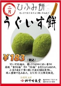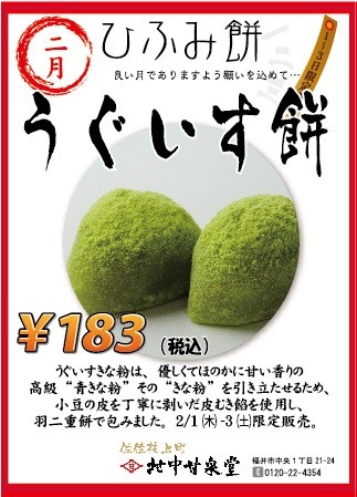 毎月1-3日だけ販売される一二三餅! 2月は「うぐいす餅」 うぐいすきな粉は、優しくてほのかに甘い香りの 高級“青きな粉”その“きな粉”を引き立たせるため、 小豆の皮を丁寧に剥いだ皮むき餡を使用し、 羽二重餅で包みました。 2/1(木)-3(土)限定販売。 1個税込183円