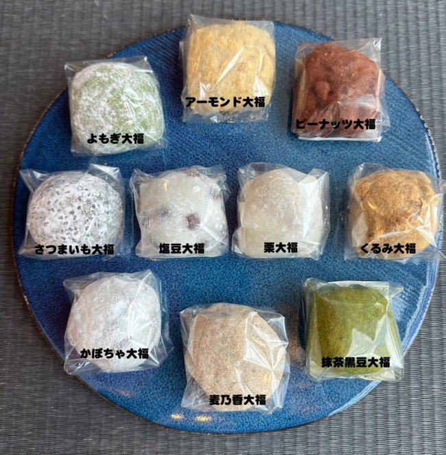 毎日いろいろな種類の大福を販売しています♪ 選ぶのも楽しくなる大福たち^^ チョコ好きな我が家の女子に アーモンド大福やピーナッツ大福が人気! 定番の塩豆大福はもちろんのこと こしあんと胡桃のコリコリ感がたまらない くるみ大福もおすすめ。 抹茶好きには抹茶黒豆だし… さつまいもに栗にかぼちゃに…と盛りだくさん♪ どれが一番!ってなかなか選ぶのが難しくなっちゃうくらいです^^