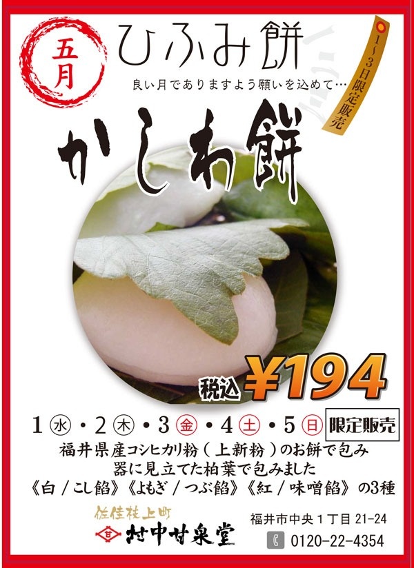 毎月1-3日だけ販売される一二三餅! 5月は「かしわ餅」 5月はゴールデンウイークのため 1日~5日まで毎日限定販売! 福井県産コシヒカリ粉(上新粉)のお餅で包み 器に見立てた柏葉で包みました 《白/こし餡》《よもぎ/つぶ餡》《紅/味噌餡》の3種 1個税込194円